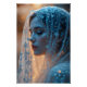 A side-profile portrait of a peaceful young woman with eyes closed, illuminated by contrasting light—warm orange from below and cool blue from above. Her face is framed by a glowing sheer blue veil with fine embroidery, while sparkling specks shimmer on her skin and drift in the surrounding air. Soft vapor curls weave gently around her, with a subtle ember glow adding depth. Rendered in hyper-realistic detail with a dreamlike, soft-focus background, the image radiates serenity and magical beauty.