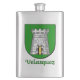 Hispanic surname Velasquez heraldic shield drinking flask. Text below the shield is in a classical style font to match the colors on the shield.
