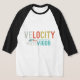 The t-shirt boasts a dynamic design with the text "Velocity Meets Vigor" in a multicolor display. Each word could be a different vibrant color, or the letters themselves could be a gradient or blend of multiple hues, creating a sense of movement and energy