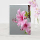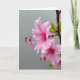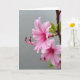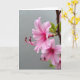 Designed with a close-up floral scene, this card features a large pink blossom centered in the frame, its soft rose petals opening like a gentle embrace ❤️. Deep fuchsia stripes radiate from the flower’s center, drawing your eye inward and giving the bloom a quietly romantic focus. Slender stamens arc outward with dark magenta tips, and one carries a tiny dusting of golden pollen that adds a tender, intimate touch. A second bloom sits softly out of focus in the lower right, creating depth as if two flowers are leaning toward each other in quiet companionship 🌼. Small green leaves and a thin branch edge into the scene, grounding the composition without stealing attention. The background fades into a muted grey-green blur under diffused light, making the petals look velvety and slightly translucent. Any greeting text would sit neatly at the top in a light, warm gray, leaving the flower unobstructed. The petal edges show subtle ripples and fine texture, with the brightest pink tones concentrated near the center.