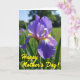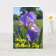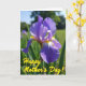 This card features a close-up of an iris-like flower, with velvety purple petals opening toward the viewer like a gentle embrace ❤️. Sunlight brightens the bloom from deep violet to soft lavender, and fine translucent veins show through like delicate lace. The background fades into a soft blur of green leaves and distant blooms, giving the scene a private, garden-corner feel where closeness can linger. Near the center, bright yellow accents ring the flower’s heart with tiny brown-and-white streaks, drawing the eye inward the way a tender glance does. A seasonal greeting sits in the lower-left area, set in cheerful yellow lettering that stands out against the darker petal tones. The words feel tucked into the scene rather than floating above it, like a quiet note slipped into a bouquet 🌼. Gentle highlights and shadows shape the petals into a rounded, layered form, while the sky behind reads as a pale, clear blue wash. The yellow text rests over the lower-left petals, with the flower’s golden center glowing sharply in focus.