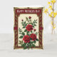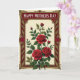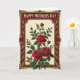 This card features a classic framed illustration with a pale cream background and a rich floral arrangement that feels like a gentle embrace ❤️. At the center, an asymmetrical cluster of deep crimson blossoms shows velvety-looking petals, with green leaves and small buds rising upward as if leaning in close. The flowers sit within an ornate frame that adds a cozy, affectionate mood, like a caring gesture shared between close family. Along the inside edge of the frame, a deep maroon border is decorated with fine golden curls and leaf-like motifs that echo the bouquet’s shapes. A muted gold outer edge gives the piece a polished finish, while tiny red dot accents in the corners add a soft glimmer 🌼. Near the top, a deep red banner holds the message “HAPPY MOTHER’S DAY” in white serif letters, centered and easy to read. The banner sits neatly within the frame above the blossoms, with the gold detailing surrounding it like a gentle halo of ornamentation. In the corners, the red stippling and gold scrollwork sit against the maroon and cream layers, creating a rich, layered look.