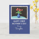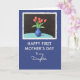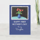 This Mother's Day card features a classic still-life scene set on a deep blue background, with a white, deckle-style border framing the artwork like a small print. Inside the frame, five red blossoms with slim green stems rise from a cobalt-blue vase, giving the flowers the spotlight with a gentle, affectionate energy ❤️. The vase sits on a pale aquamarine tabletop, while a dark, near-black backdrop behind it makes the reds and blues feel rich and intimate. Soft shading along the vase and stems adds depth, like you could reach out and trace the curve of the glass. Beneath the framed image, the lower portion stays deep blue and carries the message in white lettering. “HAPPY FIRST MOTHER’S DAY” appears in neat, all-caps type, and just below it “to my Daughter” is written in a flowing, cursive-style line that feels tender and close 🌼. The red petals are rounded and slightly layered, with small highlights that make each bloom look freshly opened.