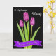 This card shows three closed, tulip-like flowers rising from the bottom against a deep black background, their deep purple petals shaded with magenta like velvet in low light. Slender green stems and long pointed leaves spread outward, as if the blooms are leaning together in a quiet, affectionate huddle ❤️. Soft highlights trace each petal edge and fade into shadow, giving the flowers a sculpted look that feels intimate and close. Near the top, a decorative white line of text sits centered above the blooms, standing out sharply against the dark space. Beneath the flowers, a curved purple ribbon with a thin white outline holds a second line of text in white, placed across the lower portion of the design. The strong contrast between the dark background and the rich greens and purples makes the arrangement feel dramatic yet gentle, like a private note shared between close friends 🌼. The leaves angle diagonally from the base, framing the trio while the purple ribbon arcs horizontally below them.