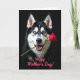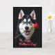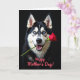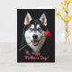 This greeting card features a large black-and-white dog filling most of the frame, posed like it’s offering a sweet gesture to someone it adores ❤️. Its bright blue eyes look forward with a gentle, affectionate focus, as if sharing a quiet, friendly connection. The mouth is slightly open in a soft grin, showing a hint of teeth and tongue that makes the moment feel approachable and warm. A single deep red rose rests carefully between its teeth, the petals detailed and plush against the dog’s dark muzzle. The background is a rich, near-black field, and the lighting creates strong contrast that brings out the fur texture and the rose’s velvety edges. Along the bottom, a short celebratory message sits centered in coral-colored lettering, standing out clearly without crowding the image 🌼. The overall layout feels intimate and romantic through the dog’s tender expression and the classic rose offering. The rose angles slightly upward from left to right, with layered petals catching the brightest highlights.