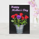 This design shows a bouquet of seven roses arranged in a rustic silver metal bucket against a deep black background, creating a quiet, intimate mood ❤️. Six roses are a rich red, their soft petals catching a gentle light that makes them look freshly opened, as if offered with care. One rose in the center is purple, drawing the eye like a special favorite in the group, and it adds a sweet contrast that feels like a small romantic surprise. Green leaves and stems fill out the arrangement, leaning and overlapping in a way that suggests closeness and connection. Near the top of the card, a short message sits centered in light lavender lettering, standing out clearly against the dark space. The text has a flowing, delicate look, almost like it’s floating above the flowers, with plenty of breathing room around it 🌼. The bucket below has a lightly ribbed surface and a muted metallic sheen, with soft highlights that hint at a focused light source. The red and purple blooms rise from the bucket in a tight cluster, with the purple rose positioned slightly forward at the center.