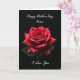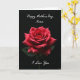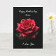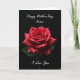 This design shows a single deep-red rose centered on a tall, black background, drawing your eyes straight to the bloom ❤️. The petals open in layered folds, and their soft curves suggest a gentle, romantic touch, like someone carefully offering the flower to a loved one. Tiny water droplets cling to the petals and catch the light, adding a fresh, just-misted look. Soft lighting highlights the rose’s contours while the dark backdrop stays in shadow, making the flower feel sculpted and intimate. A few green leaves and a sturdy stem peek out beneath the blossom, adding a natural grounding detail. White cursive-style lettering sits near the top and again near the bottom, standing out clearly against the dark space 🌼. The red petals show fine texture and scattered droplets, with a small cluster of green leaves visible at the lower edge.