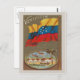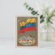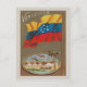 Vintage Venezuela card from a late 1800s color lithograph shows a Venezuela flag with yellow, blue, and red stripes and white circcle of stars, along with a vignette illustration of buildings, a palm tree, and a farmer with animals pulling a cart.