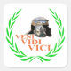 Ancient Roman military helmet made of copper metal. Text Veni, Vidi, Vici. Drawing of a green laurel wreath around. Square format products and gifts. Square Sticker