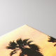 This photo shows a beautiful golden yellow, orange, red, and purple sunset over the Pacific Ocean in Venice Beach California. The scene has silhouettes of people walking along the famous boardwalk near the towering palm trees lining the shoreline of sand and sea.