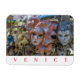 A photograph of beautiful carnival masks for sale on a market stall in Venice in Italy printed on a souvenir fridge magnet.
