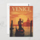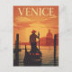 A romantic vintage-style travel poster capturing a tranquil moment in Venice, Italy. The illustration shows a gondolier steering his boat on the Grand Canal at sunset. The classic Venetian skyline, including the iconic dome of Santa Maria della Salute, is silhouetted against a warm, orange sky and the glowing sun. This retro design is perfect for those who love romantic destinations, Italian culture, and classic travel art. It evokes a sense of timeless elegance and makes a beautiful decor piece.