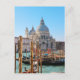 Colourful gondolas moored on wooden poles, in front of the Basilica di Santa Maria della Salute, Venice, Italy. With bright blue skies.
