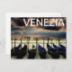 A beautiful travel postcard from Venice, Italy, with a line of gondolas in the front, the Grand Canal in the back, and Venezia written across the sky. Great for vacations and tourists in Venice.