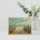 This Greetings From Ventura vintage postcard design features a sandy beach with a beautiful turquoise ocean water and above the sea, a blue sky with billowy white clouds. In vintage travels style.