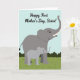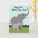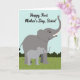 This card shows two gentle grey elephants, a larger adult beside a smaller youngster, standing close as if sharing a quiet, affectionate moment ❤️. The adult is a deeper grey and the little one is a lighter grey, and their soft eyes and relaxed posture suggest a caring bond between sisters and family. Across the top, the message “Happy First Mother’s Day, Sister!” is placed in flowing dark lettering that stands out clearly against the pale sky. Below them, a bright green strip of ground stretches across the bottom, with rounded leafy bushes in deeper green behind their feet. The sky is a smooth light blue, giving the scene an open, calm setting that feels like a peaceful park. The adult’s trunk lifts slightly, like a friendly wave, while the smaller elephant tilts its head toward the adult in a shy, trusting way 🌼. Simple shapes and gentle shading keep the focus on their closeness and the sweet exchange between them. Small curved lines define their ears and trunks, and the bushes form soft, layered mounds along the horizon line.