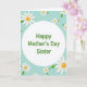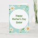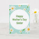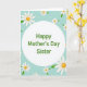 This greeting card features a large white circle centered on a soft pastel aqua background, creating an open, airy setting. Inside the circle, a multi-line message sits neatly in the middle in a bright green sans-serif font, easy to read against the white space. Around the circle’s edge, several stylized daisy-like flowers overlap the border as if they’re leaning in close, giving the layout a gentle, friendly closeness ❤️. Each flower has crisp white petals and a golden-yellow center, with small green leaves tucked beside some blooms for a fresh spring touch 🌼. The flowers are scattered in a loose ring around the circle, leaving enough breathing room so the text remains the main focus. The cool aqua backdrop balances the sunny yellows and greens, like a calm day where warm feelings quietly show through. The central circle is framed by overlapping white-petaled blossoms with yellow centers and small green leaves against the pastel aqua field.
