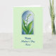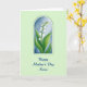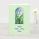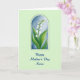 This card features an arched window frame that holds a calm botanical scene, centered on a drooping stem of small, bell-shaped white flowers that feel like a quiet gift offered with affection ❤️. Several blooms are open while a few are still buds, and the way they lean together suggests a gentle closeness, like friends sharing a private moment. Broad green leaves fan out beneath them in layered shades, adding a grounded, protective feel around the delicate petals. Inside the arch, a soft sky-blue wash with a light painted texture sets a peaceful backdrop that keeps the flowers in focus. A thin white outline traces the arch, followed by a narrow sage-green inner border that adds depth like a little window cutout. Beneath the arch, a wide field of pale mint-green fills the rest of the front, keeping the overall look airy and fresh 🌼. Near the lower area, a short message appears in flowing dark blue lettering, centered under the floral window. The flowers glow softly against the blue background, with crisp white petals and tiny green stems standing out within the arched frame.