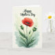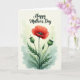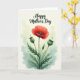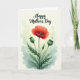 This card features a striking crimson flower with softly unfurling scarlet petals, drawing the eye like a romantic focal point ❤️. At its center sits a dark, detailed pistil, adding depth and a slightly dramatic contrast. The bloom rises from spiky green leaves and slender, textured stems that feel fresh and lively. On either side, two round green seed pods sit in a balanced arrangement, like quiet companions leaning in close. Behind the botanical cluster, gentle washes of sage green and soft aquamarine create a misty, early-morning garden atmosphere 🌼. Near the top, a short Mother’s Day message is placed above the artwork in a flowing dark font, standing out clearly against the pale background. The overall layout keeps the text airy and the illustration centered, with plenty of open space around the flower. The background fades from light green to bluish tones with a soft, watercolor-like haze.