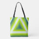 This image is a geometric abstract design featuring nested, concentric triangles. The triangles are arranged in a way that creates an illusion of depth and perspective, drawing the viewer's eye toward the center. The color palette consists of various shades of green—from deep teal to bright lime and pale green—which blend seamlessly to form a visually striking gradient. The symmetry and repetition give it a dynamic, modern feel, making it suitable as digital art, a background, or even print design.