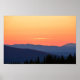 Wind turbines stand atop the Green Mountains west of Lake Willoughby and Westmore in Vermont. The hills appear as abstract shapes as the sun sets in a brilliant blaze of orange.