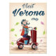 Verona Italy holiday poster. Cartoon man on a little Italian scooter.
