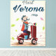 Verona Italy holiday poster. Cartoon man on a little Italian scooter.