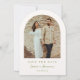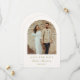VERONA Moss green typography, arch frame photo save the date card. Features, Website QR code template option on back.