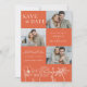 This Verona Sunset Elegant Orange Floral Four Photo Wedding Save the Date Invitation showcases four of the couple's photos, with delicate line art flowers on a vibrant orange background, complemented by contemporary typography and script calligraphy. It is fully customizable with the couple's names, wedding details, and photos of your choice. The formal design and wording will add a touch of elegance to your wedding celebration. The back photo has a white gradient at the bottom, so the couple's names will show up over any photo.