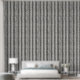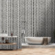 This trendy wallpaper features vertical black stripes and gold confetti pattern. The perfect accent to your home decor.