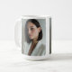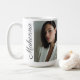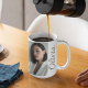 The Vertical Moment with Name coffee mug features a full-length portrait image paired with a vertical script name along one side. With a white base and black text, the sleek editorial layout creates a modern and memorable design inspired by magazine aesthetics.