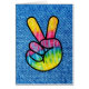 Colorful tie-dye icon from the 1960s peace movement on a background of blue denim. The two-fingered salute represents a preference for peaceful solutions over the alternatives. Psychedelic tie-died fabric may be retro now, but in the 60s it was a hippie fashion statement. Customize the greeting text by changing the words, text style, color and font. Also available as a horizontal card.