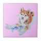 This a very cute sheba Inu puppy is part of my part of my puppy portrait collection. Her name is Sushi and she looks so appealing and adorable as she rests her paw on her pink piggy toy. Her little sheba puppy expression looks as if she’s trying to entice her owner to play and that’s why I titled this puppy portrait painting “Squish Mr. Piggy!” I think she this little sheba pup looks really sweet on this art tile and will make a lovely gift for your friends and family, especially the ones who love cute puppies and Sheba inu puppies definatly have the cuteness factor. But maybe you just want to spoil yourself with this puppy tile as a very special treat. This paticular tile has a lilac background. I painted Sushi the sheba Inu‘s portrait in water-colour.