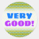 This sticker design features a pattern that involves yellow and green diamond shapes, and black lines. It also features the encouraging message "VERY GOOD!" in blue and purple colored text. Stickers like these could perhaps be used by a teacher, an educator or a tutor to acknowledge encourage a student who has done well on a test, quiz, paper, project, or some other academic school or assignment. [~Z0000118]