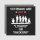 Veterans Are Not Losers Or Suckers. This anti-Trump design refers to Donald Trump calling military soldiers who were injured or killed in war losers or suckers. Support our troops and show just how much you value them, even if President Trump doesn't. Donald Trump calling our fallen soldiers who died in battle "losers" and "suckers" is disgusting, even for him. He is a traitor and shows nothing but disdain for our wounded, killed or MIA troops. Vote him out this November in the 2020 election!