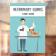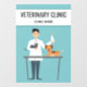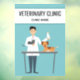 Cute design for veterinarians and veterinary clinics featuring Destei's cartoon illustration of a veterinarian man with some animals. The man is wearing a white laboratory coat while holding a gray cat and a cockatiel type parrot bird. There is also a cute little brown dog lying on a table. The background color is blue. Personalize the sample text areas with your custom text.