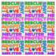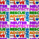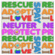 Colorful animal rescue wording, "spay, neuter, adopt, protect, rescue and love", with paws and dog bone graphics.