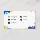 A modern and colorful business card featuring abstract shapes in blue, pink, yellow, and turquoise on a dark blue background, with space for a name/handler.