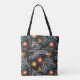 Immerse yourself in a dynamic fusion of color and form with this abstract floral tote bag. Featuring stylized flowers in vivid red, orange, and yellow hues, complemented by flowing wavy lines and scattered blue and white dots, all set against a deep black background, this tote bag exudes a bold and energetic aesthetic. The interplay of vibrant elements creates a striking contrast, making it an ideal choice for those seeking a unique and artistic touch. This tote bag appeals to lovers of modern botanical art and abstract expression.
