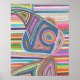 This bold abstract design features layered geometric shapes outlined in vivid colors, flowing seamlessly across a striped multicolor background. Bright shades of blue, pink, yellow, orange, green, and purple create a lively rhythm, while concentric lines and angular forms add depth and movement. The combination of organic curves and sharp edges gives the piece a modern, energetic feel perfect for those drawn to colorful contemporary patterns.