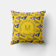 Vibrant African Ethnic Geometric Monogram Throw Pillow, in blue, mauve and white against a vibrant YELLOW background. The monogram is CUSTOMIZABLE, so you can add your initial. There is curved Christian text - God is our Refuge and Strength - at the top, and a curved placeholder name at the bottom. BOTH OF THESE ARE CUSTOMIZABLE so you can create your own preferred wording and add your name on the easy-to-use template. This African inspired ethnic geometric pattern monogram throw pillow would make a great addition to colorful decor themes. Choose from a wide and varied selection of monogram, Christian and patriotic throw pillows, designed by Berean Designs. Other ethnic geometric patterns and colors are available.