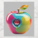 This image showcases a vividly colored, digitally rendered apple that combines an array of bright, contrasting hues. The apple features a glossy finish with a smooth, reflective surface. In the center of the apple is a carved heart-shaped cutout containing a smaller apple symbol, emphasizing a playful, layered design. The apple's stem is topped with an artistic combination of an orange and green leaf, adding an extra splash of color and creativity.