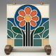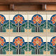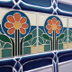 Add a touch of timeless artistic flair to your home with this stunning ceramic tile, inspired by the elegant Art Nouveau movement. The design showcases a beautifully stylized daisy, bursting with color. Its vibrant orange-red petals radiate from a cheerful sunny yellow center, creating a warm and inviting focal point. The flower is artfully framed by a bold royal blue arch and flanked by lush, deep green leaves. The composition rests on a geometric base of muted beige and teal, grounding the organic forms above. Each colored section is outlined with clean, creamy-white raised lines, giving the tile a delightful tactile quality and a look reminiscent of classic stained glass. This versatile tile is perfect for creating a memorable accent in a kitchen backsplash, bathroom, or as a unique decorative piece.