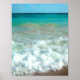 Vibrant and saturated colors in this relaxing beach scene with bright blue teal aqua water and white waves crashing on the brown sand. Watercolor digital painting with some light grunge and aging effects. A colorful touch for any decor or gift.