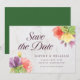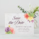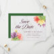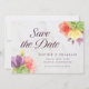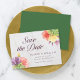 This elegant floral save the date card features vibrant blooms with the words "save the date" in trendy script all against a pale marble background on the front and a green color back side.
