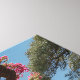 An ancient tree heavy with brilliant magenta-pink blossoms arches over a lush, sunlit garden paradise. Symmetrical beds overflow with intense orange, yellow, purple, hot pink, and white flowers framing a winding stone path that leads to a tranquil pond reflecting distant palms and rugged mountains. White colonial buildings nestle among tropical greenery under a perfect blue sky, creating an atmosphere of pure joy, abundance, tranquility, and timeless natural beauty. Perfect for living rooms, sunrooms, bedrooms, home offices, meditation spaces, bathrooms, or as uplifting gifts for gardeners, nature lovers, wellness seekers, or anyone who finds peace and happiness in vibrant, flourishing landscapes.