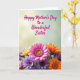 This greeting card features a tall layout with a cheerful message hovering above a lush cluster of daisy-like flowers. The lower portion is filled with layered blooms in pink, purple, yellow, and orange, arranged so closely they feel like a friendly gathering. A standout pink flower sits near the center, its petals fanning outward around a textured yellow‑green middle dotted with tiny magenta points, like a tender heart at the center of the scene ❤️. Gentle, diffused light softens the edges of each petal and adds a cozy glow, suggesting closeness and care in the way the blossoms lean toward one another. Behind the bouquet, the background fades from light lime green into pale teal, blurred so the flowers feel forward and intimate. Across the upper area, the text reads “Happy Mother’s Day to a Wonderful Sister,” placed in a flowing magenta style that contrasts against the cool background and draws the eye first 🌼. The bouquet shows a mix of daisy-like shapes, with warm orange and sunny yellow flowers tucked among deeper purple petals near the bottom edge.
