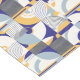 A sophisticated dining room Art Deco table runner adorned with A geometric pattern composed of various shapes and lines. It features semi-circles, rectangles, and squares, each with different summer colors combinations. The dominant colors are blue, yellow, and white. The design is symmetrical, with each half mirroring the other. The pattern is intricate, with lines forming concentric circles and intricate patterns within the shapes.