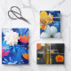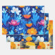 A vibrant three-sheet gift wrap set featuring bold botanical illustrations on deep blue backgrounds with warm sunset accents. Fantasy florals, abstract landscapes, and painterly textures create a striking, modern aesthetic—perfect for birthdays, celebrations, and creative gift presentations.