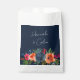 Elements: vibrant watercolor flowers and greenery with names in a fun modern handwritten style. Colors: Blue, navy, dusty blue, orange, terracotta, burnt sienna, red, crimson, green. Themes: botanical, elegant, chic, modern, romantic, casual, garden, fall, spring, summer, outdoors. Collection: Vibrant Blue Orange Red Botanical Wedding Collection. Product Type: Favor Bag